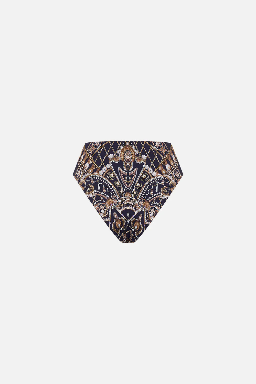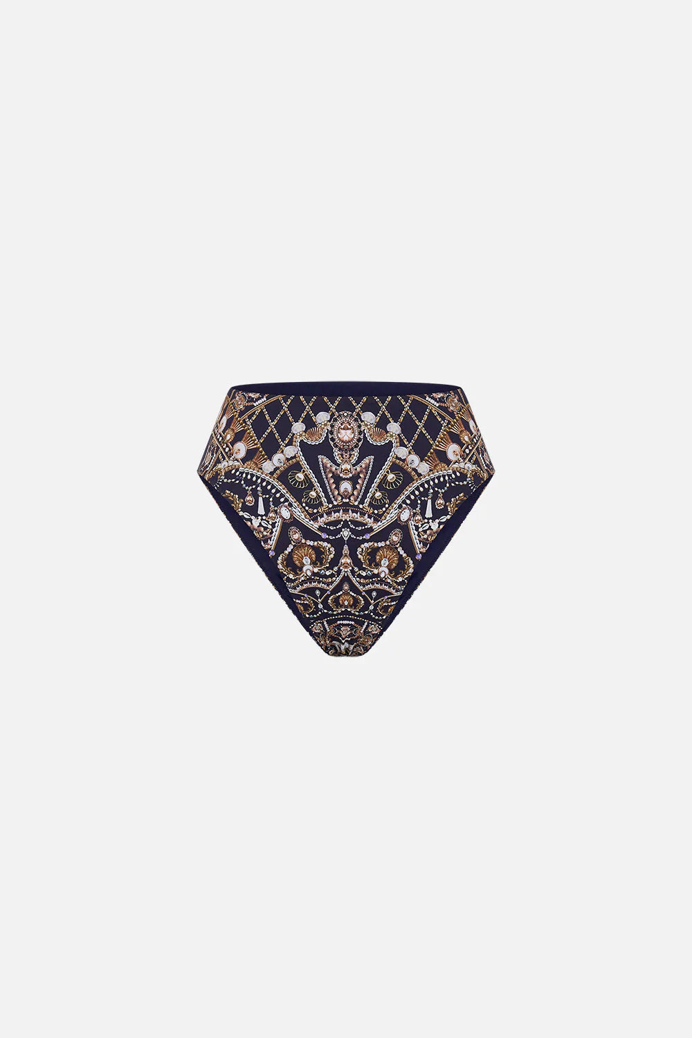 The Dance With The Duke High Waist High Leg Pant embodies intricate mosaics of delicate shells pearls and opulent golden flourishes upon a dark navy background. This luxury CAMILLA bikini bottom is crafted form sustainable materials and features a high waisted silhouette with sculpted lines to elongate the leg and cinch in the waist for a sophisticated svelte upon your curves.