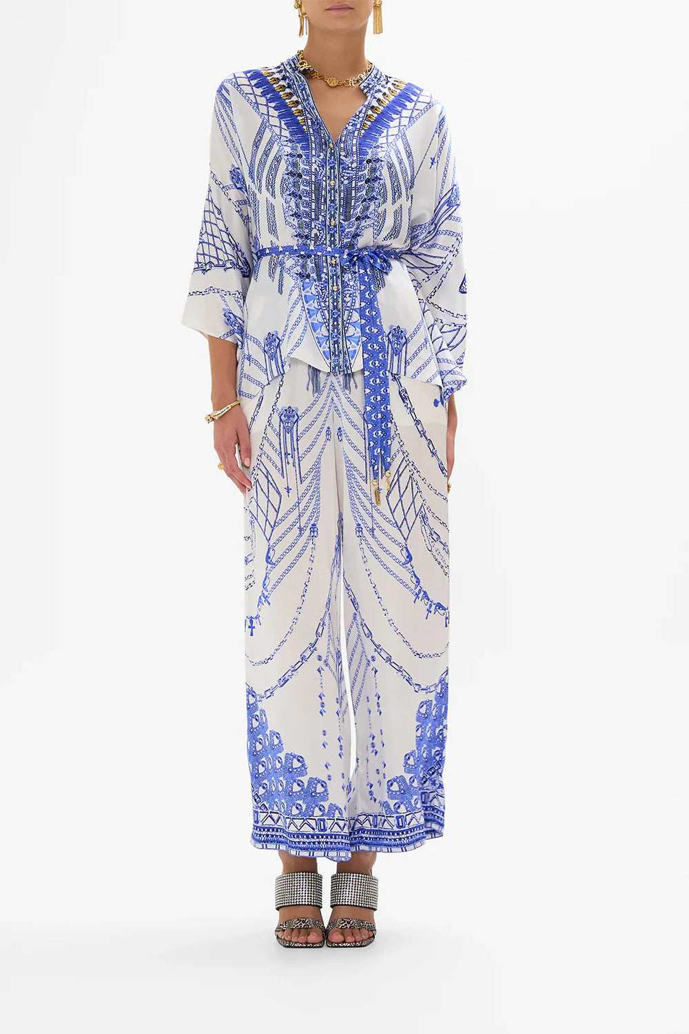 Designed in Australia, The Dancing With Daylight Button through Scarf Blouse embraces the ethereal charm of ancient realms. Blue and white hues mingle with delicate flecks of gold, capturing the timeless elegance and divine light of deities. Lovingly handcrafted, this blouse features a relaxed off body fit with a hip length cut and a scarf square shape. It is elegantly detailed with a front button closure and adorned with sparkling crystal embellishments, combining effortless style with a touch of allure.