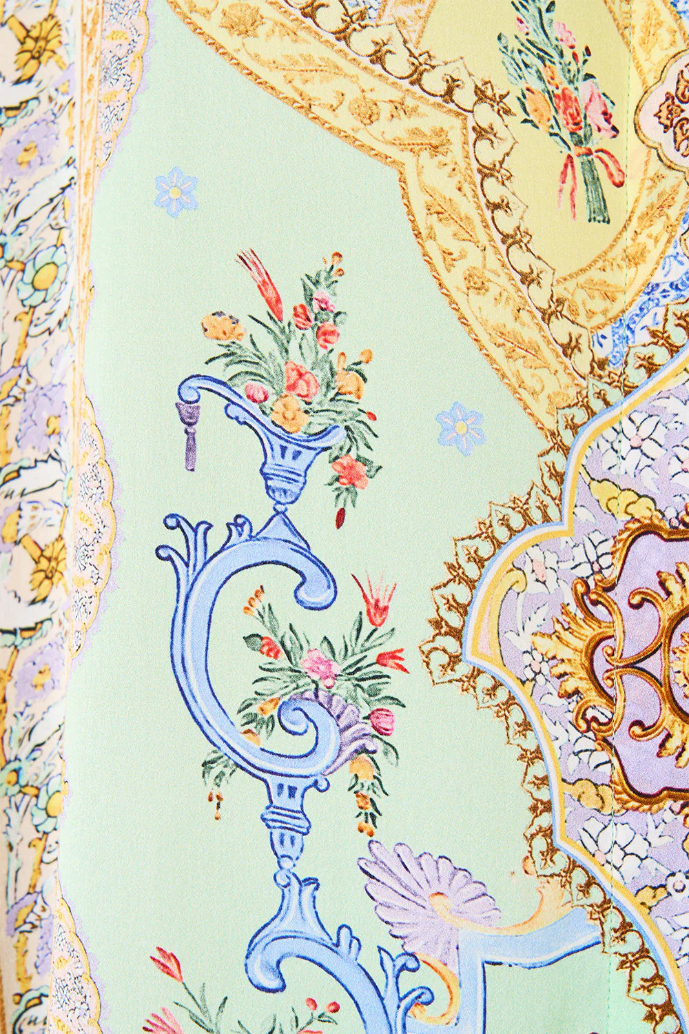 The East Of Istanbul Curved Collar Blouse is a handcrafted silk silhouette designed by our in house artisans. Reimagined in an exclusive limited edition print, our curved collar blouse is relaxed fitting and features a button front closure for effortless wear. Finished with generous blouson sleeves that taper into split cuffs, it's decorated with intricately placed crystal embellishments.