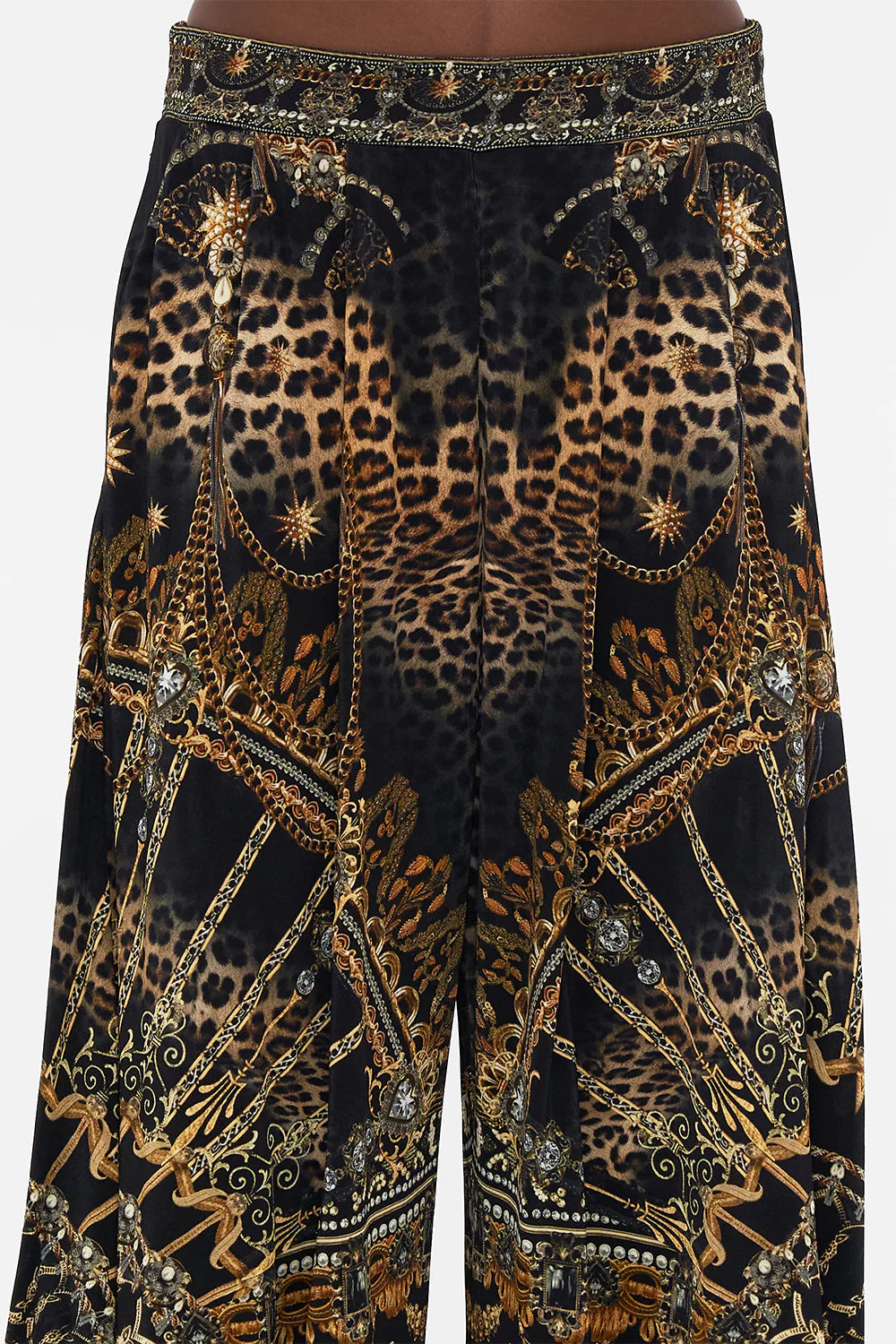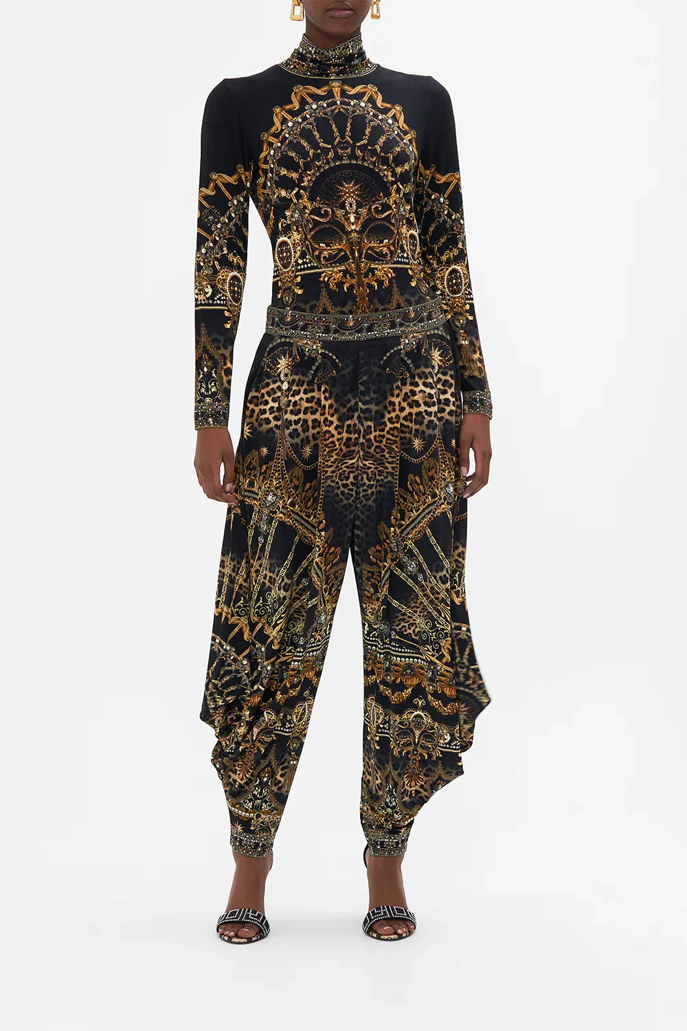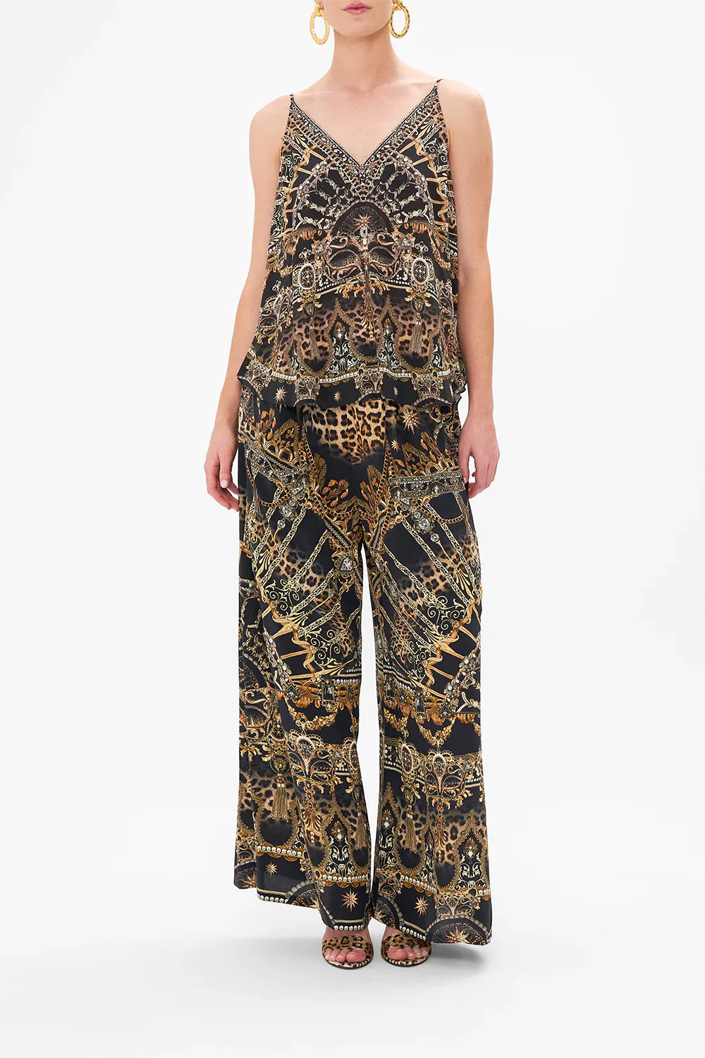The Masked At Moonlight V Neck Cami is a decadent dance of black and gold artistry. Lacework of chains and charms form intricate Venetian masks and fans to reveal lavish leopard. Adorned with exquisite CAMILLA crystals, this luxurious silk cami is a true statement piece.