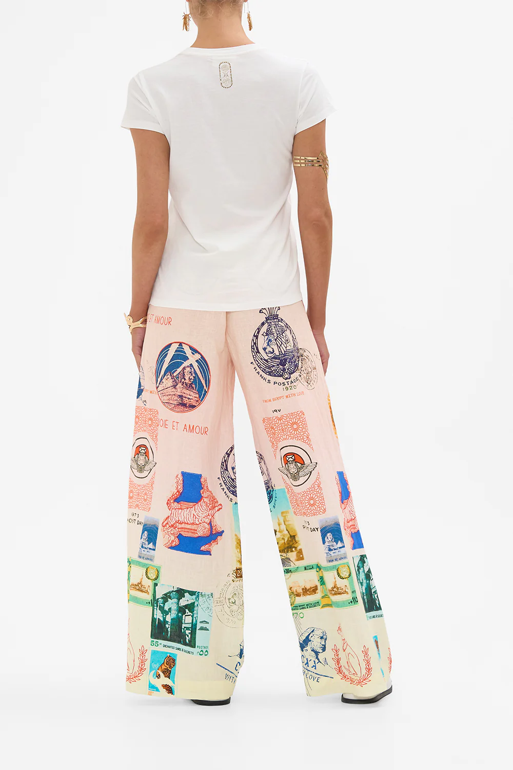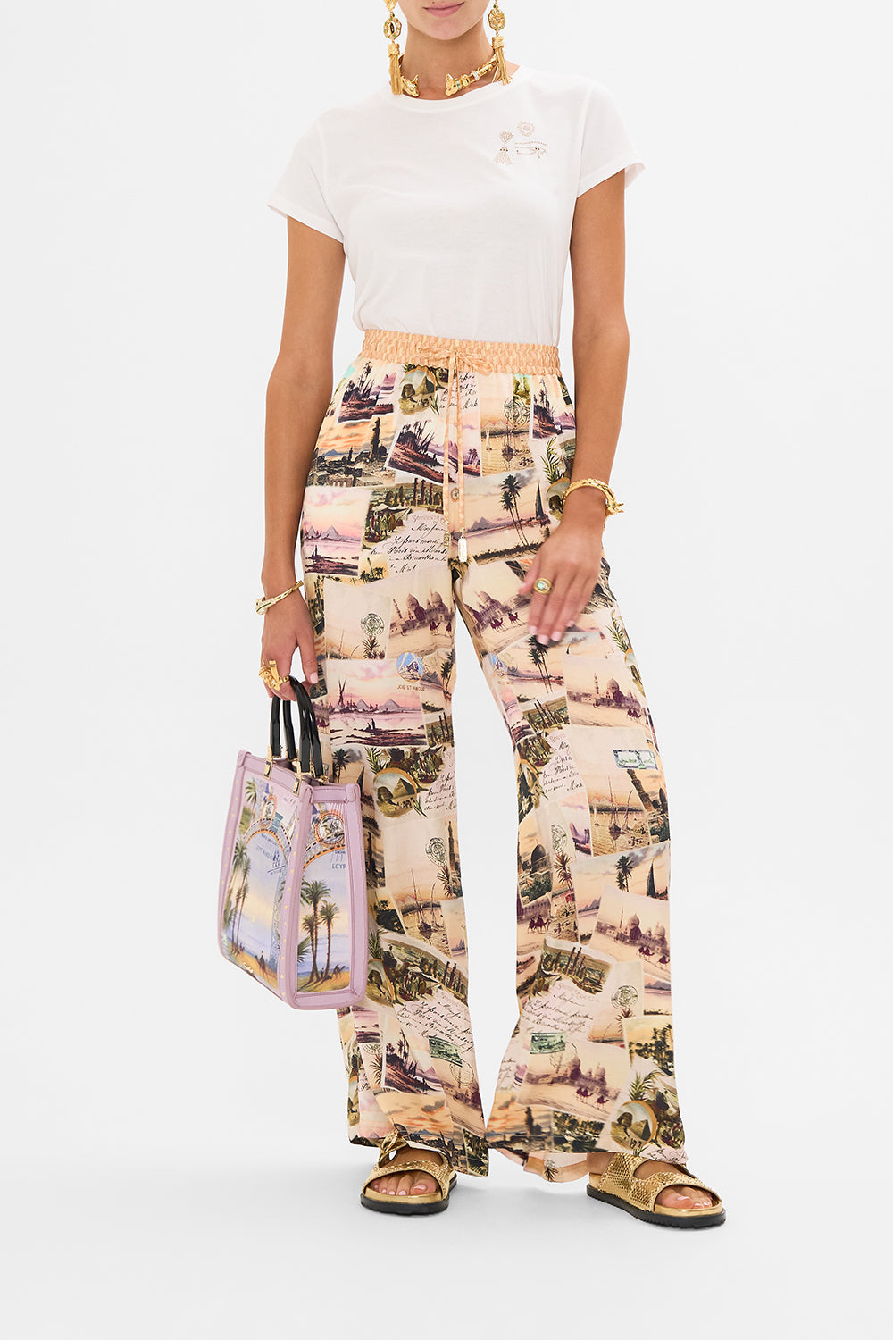 The Milla's Got Mail Slim Fit Round Neck T-Shirt - White showcases luscious pink sunset skies upon an endless oasis of desert palms and majestic pyramids. This luxury graphic t shirt features a slim fit throughout the body that falls to a hip length hemline. The neat short sleeves echo the slim silhouette adding a feminine touch to this elevated staple piece.