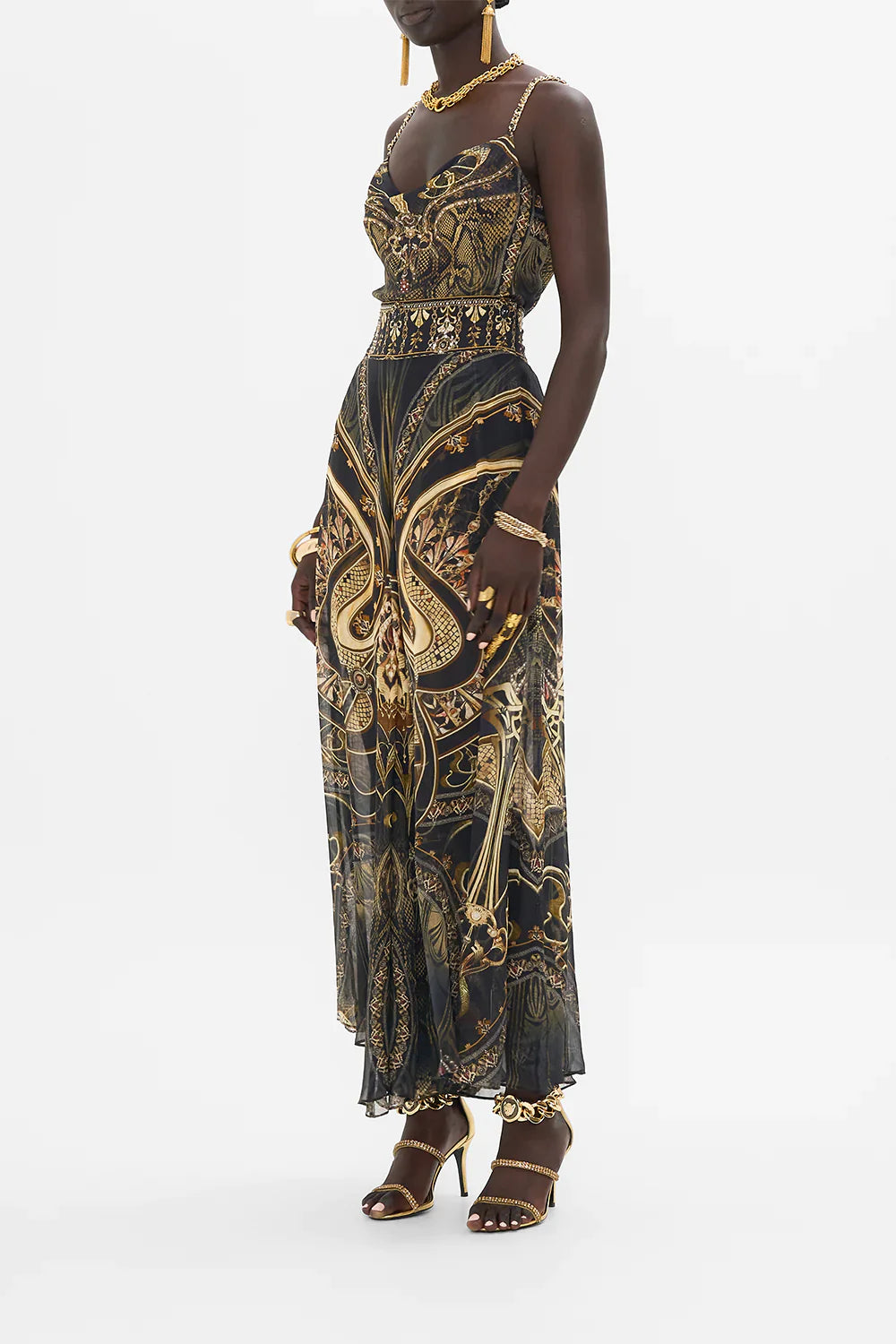 The Nouveau Noir Bias Cami is a bold stain-glassed world of golden scrolls and swirls. Elevate your wardrobe with the captivating beauty of our luxury silk camisole, adorned with exquisite CAMILLA crystals. This opulent top features a softly draped cowl neck. The relaxed bodice gracefully flows into a flared hemline, creating a chic silhouette that softly skims your curves. The rouleau straps can be adjusted to your desired length, ensuring a personalized fit.