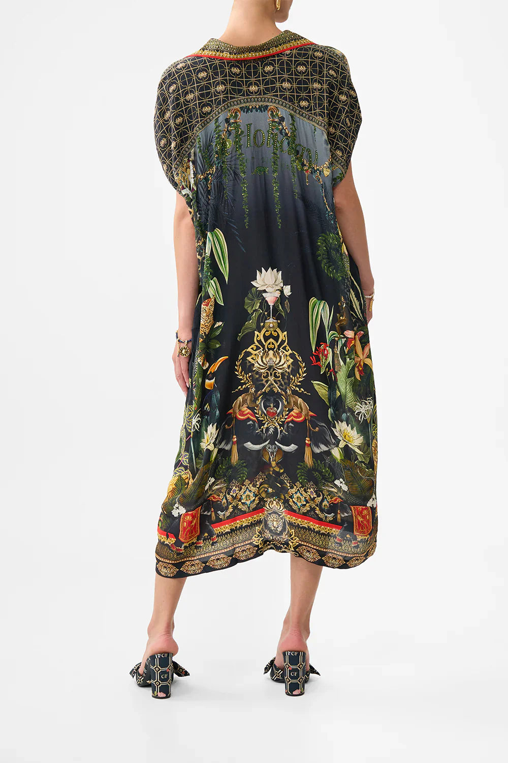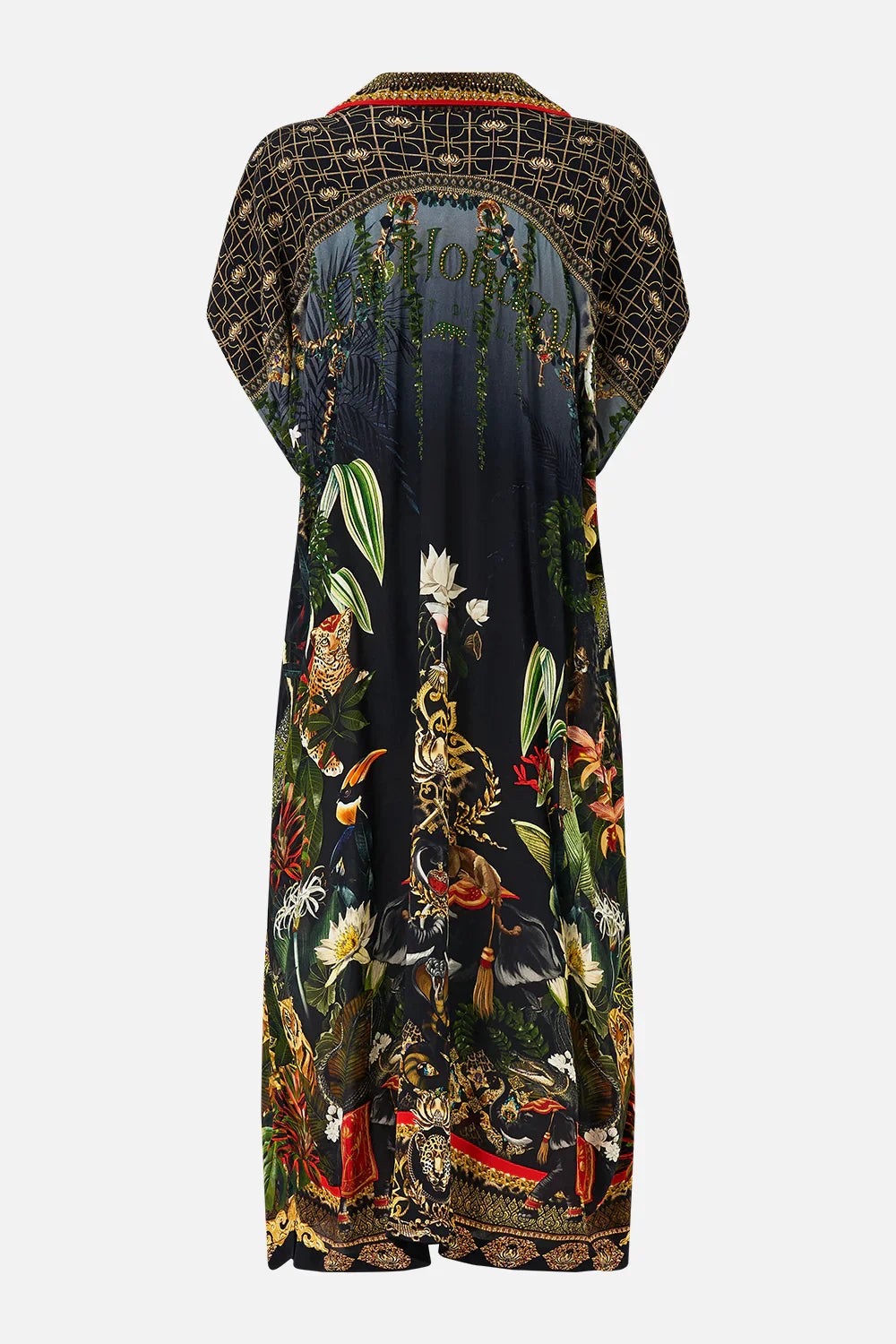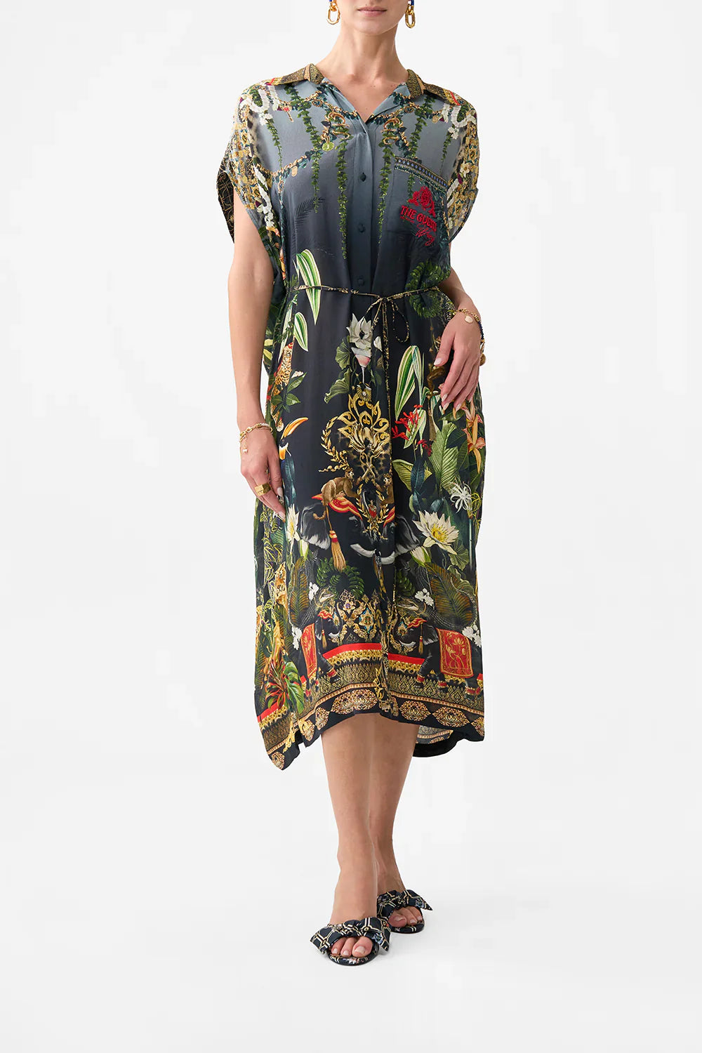 Designed in Australia, The Ready For My Welcome Drink Sleeveless Shirtdress checks you into The White Lotus, where exotic blooms and untamed wildlife intertwine, weaving an enigmatic tapestry that evokes the mystery of global explorations. Lovingly handcrafted, this shirtdress offers a relaxed fit in a graceful midi length. The button-through front and waist tie provide a flattering silhouette, while crystal embellishments add a touch of refined elegance to this effortlessly stylish piece.