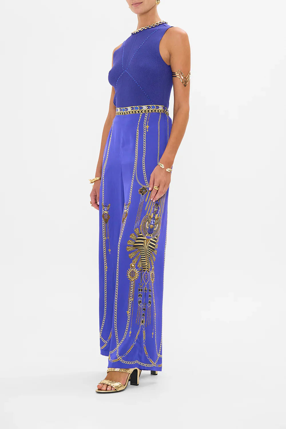 My Fair Pharaoh Sleeveless Knit Tank Top captures the intricate gilded artworks of ancient Egyptian gods and goddesses that shimmer against a regal blue. This luxury knit top features a chic crew neckline that flows into a fitted silhouette that falls to hip level. With chain embellished details and a keyhole and button back detail, this CAMILLA knit top exudes statement styling.