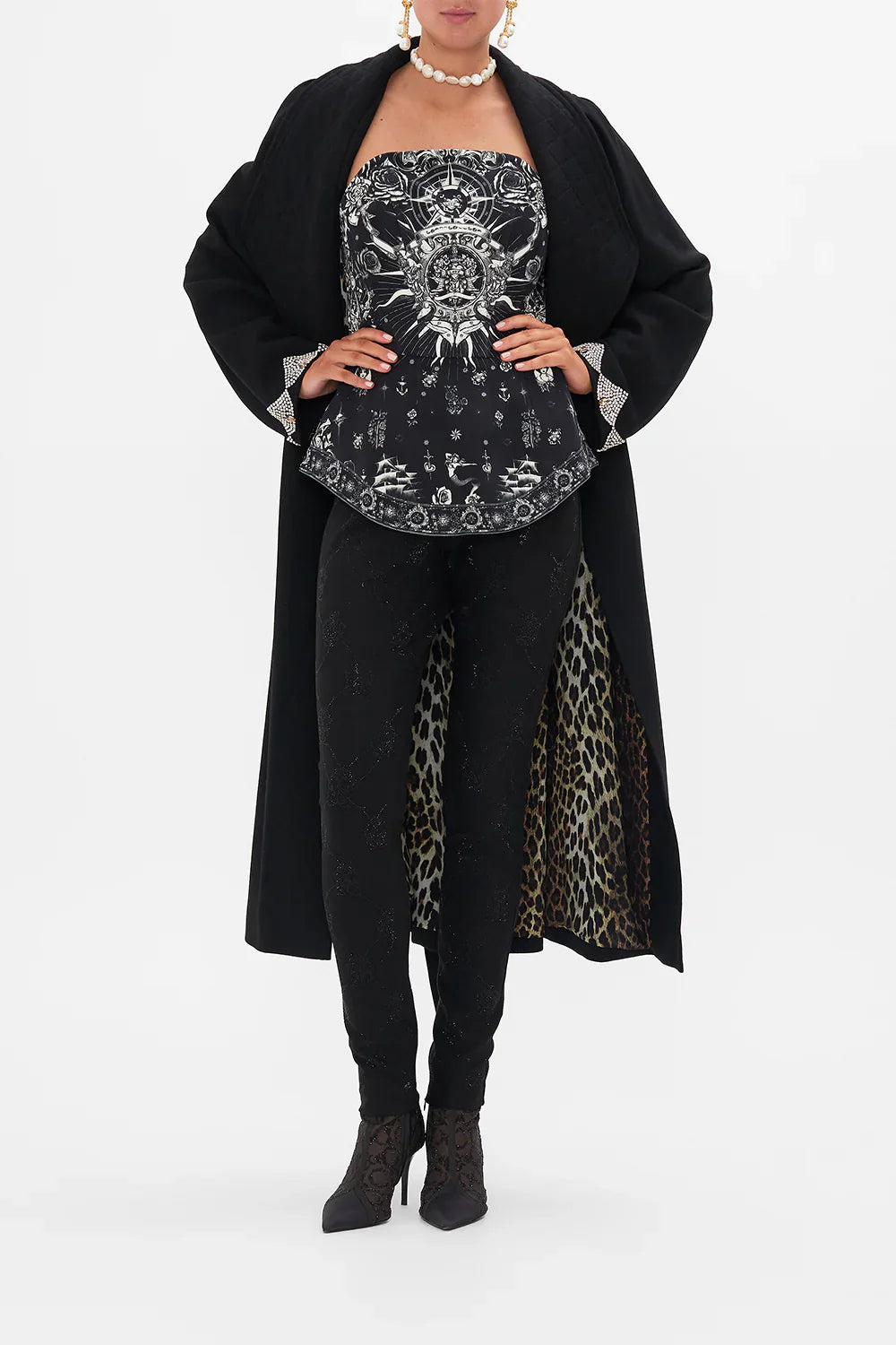 The Tales Of Tattoo Curved Hem Zip Detail Corset explores the intricate illustrative beauty of vintage tattoo artistry in timeless monochrome. This luxury silk corset features a fitted structured silhouette, cinched in the waistline with a peplum flare. The curved hemline paired with lowered back neckline and zip enclosure accentuate the lavish streamlined silhouette.