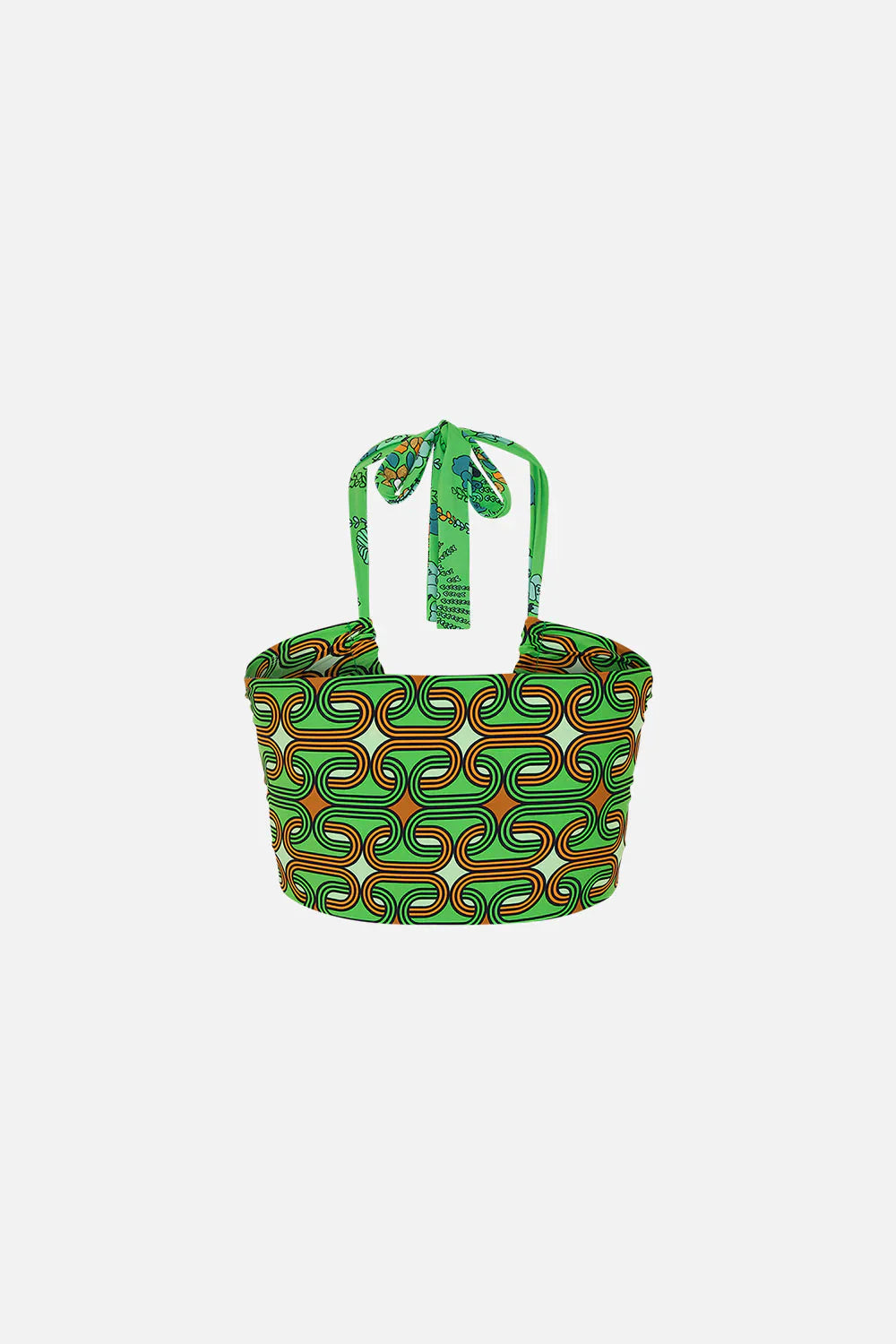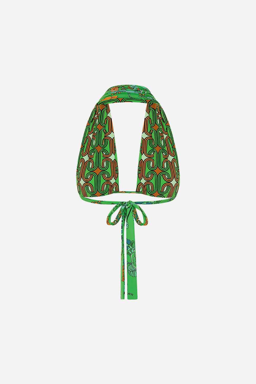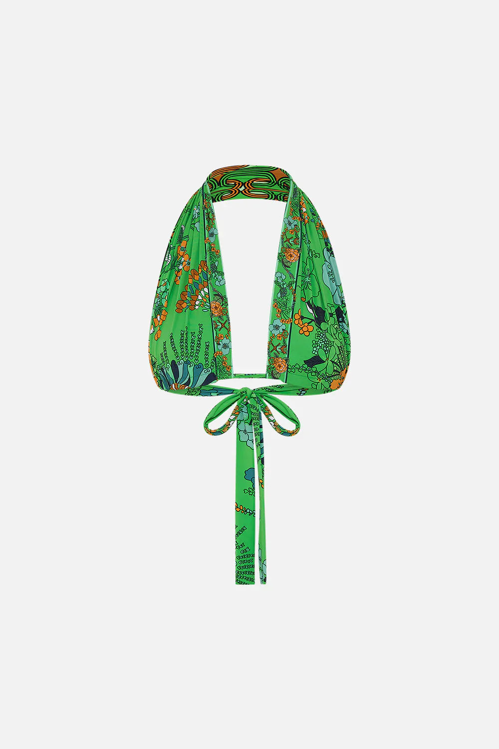 The Good Vibes Generation Halter Top depicts a 70's inspired scene of vivid green imbued with retro florals. This luxury CAMILLA bikini top features a fitted silhouette with a triangle bust cups and adjustable tie back detail.