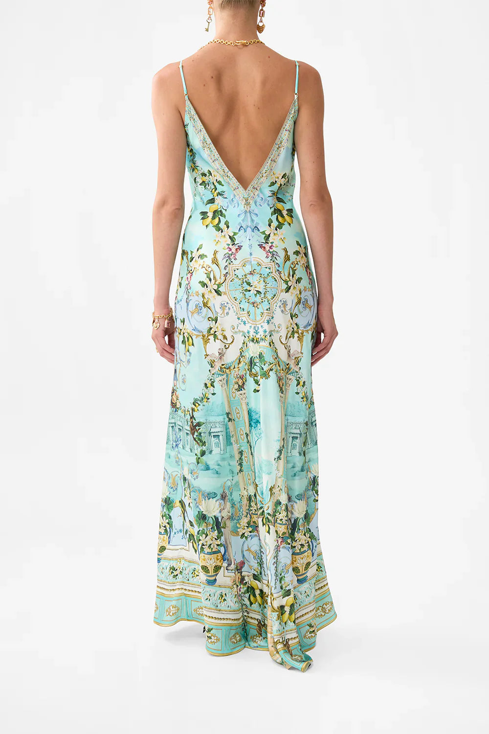 Designed in Australia, The Venus On A Vespa V Neck Long Bias Slip Dress With Train exudes placid blue skies amid ornate archways and gilded borders, a collection reimagining intricate illustrations by Lezio Lopez. Lovingly handcrafted, this CAMILLA silk dress features a bias cut shape that skims beautifully across the curves of the body into a full-length hemline with a slight train detail upon the back. The deep V back neck and delicate adjustable shoulder straps exude unparalleled opulence.
