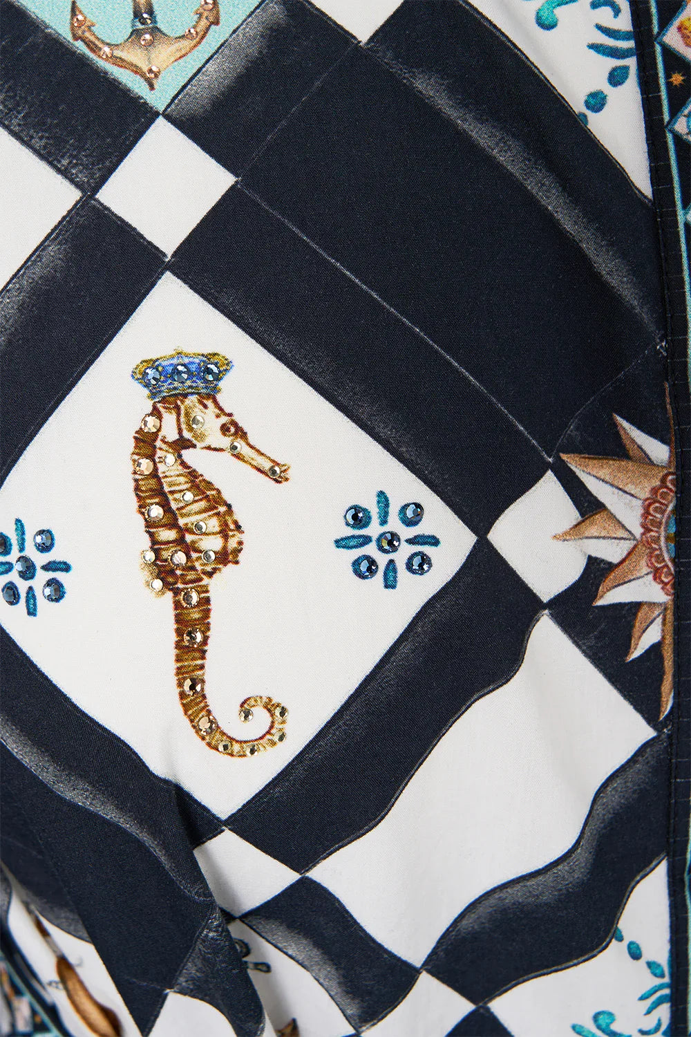 Designed in Australia, The Folk Afloat Waist Tie Shirt Dress With Bubble Sleeve sings of Portugal’s coastal dreams—intricate patterns and soft hues drift through a decadent world of wonder and whimsy. Lovingly handcrafted, this waist-tie shirt dress is a perfect blend of feminine and practical. Featuring a button through front with collar stand and shirred back panel for flattering fit, bubble sleeves add volume and create a flattering voluminous silhouette.