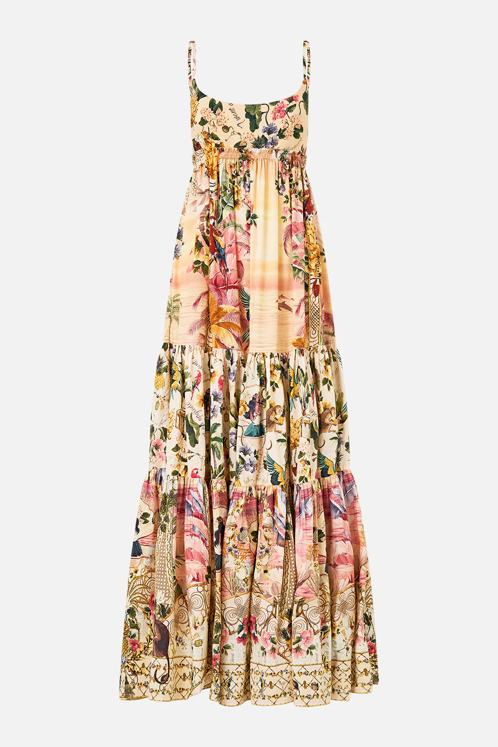Designed in Australia, The Welcome To The White Lotus Long Dress With Jersey Bodice invites you to the CAMILLA x White Lotus collaboration, where luscious sunset reveries and precious secrets collide in a decadent realm of mystery and wayfare. Lovingly handcrafted, this dress radiates exquisite sophistication. A fitted bust, maxi length, and hardware closure at the back are accented with crystal embellishments for added elegance.