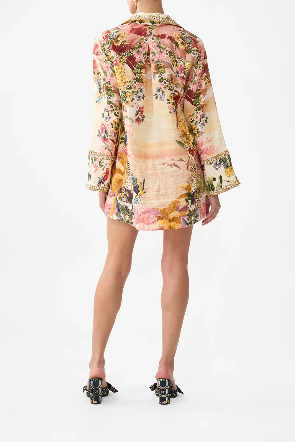 Designed in Australia, The Welcome To The White Lotus Long Sleeve Tunic Dress invites you to the CAMILLA x White Lotus Collaboration, where luscious sunset reveries and precious secrets collide in a decadent realm of mystery and wayfare. Lovingly handcrafted, tunic dress showcases a relaxed straight fit with a stylish short length. Its retro collar shape and deep V-neck add a touch of vintage charm, while the front patch pockets offer practical elegance. Adorned with crystal embellishments and featuring a button front closure, it combines classic sophistication with modern allure.