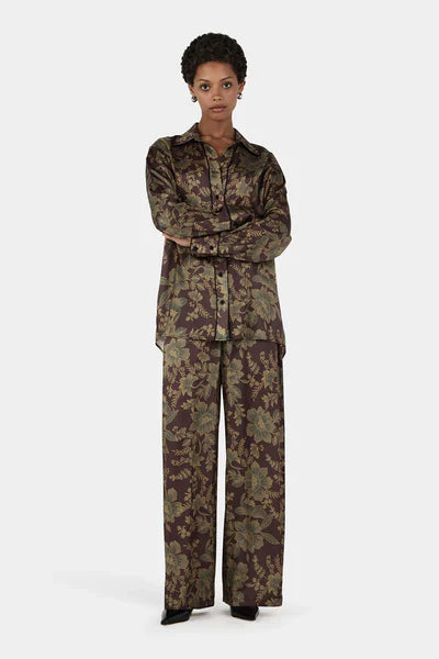 The Ambrose Shirt is a classic oversized button-down, with an exclusive placement Gilded Garden print. Features include a classic collar, billowing sleeves and a scooped back hemline.
