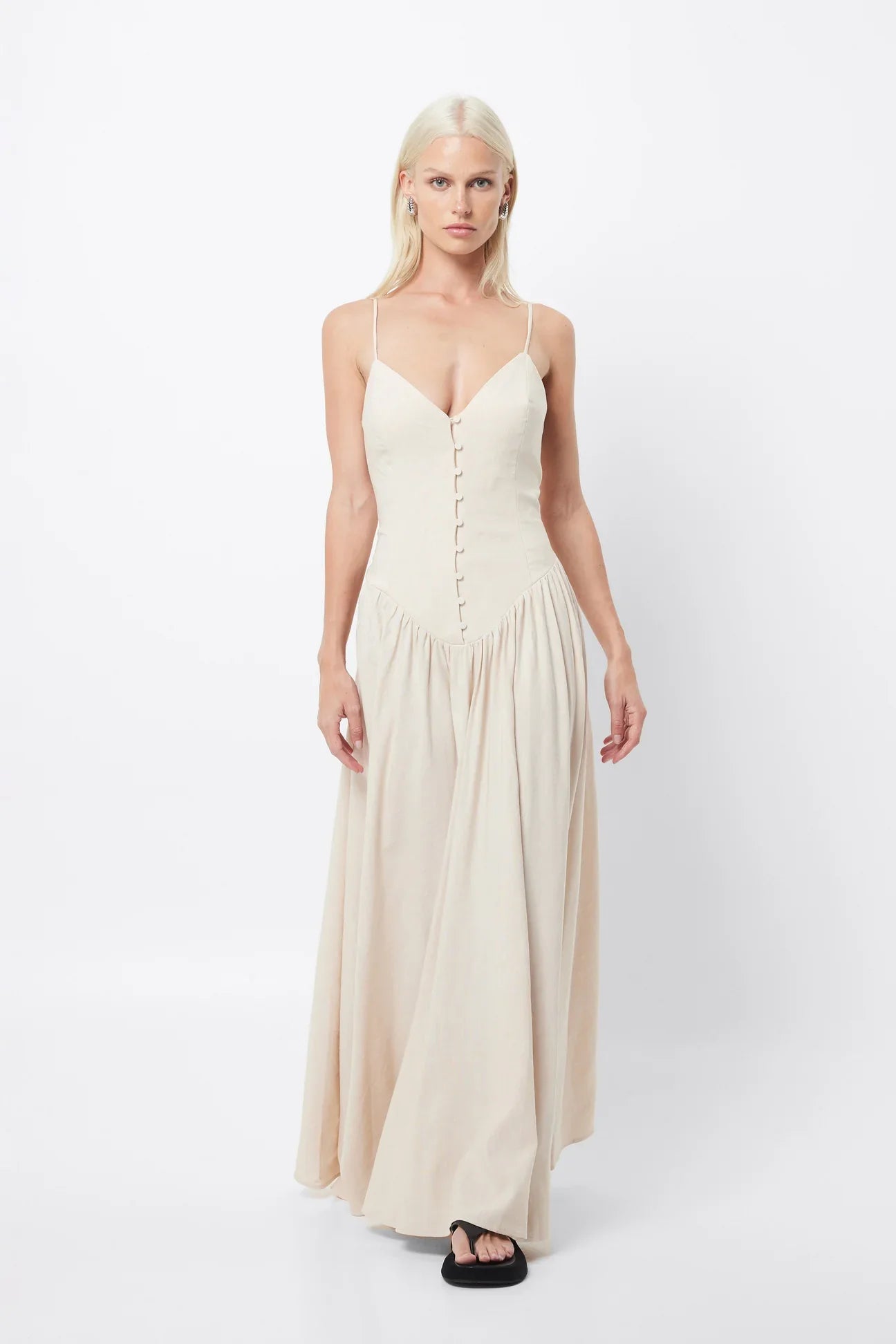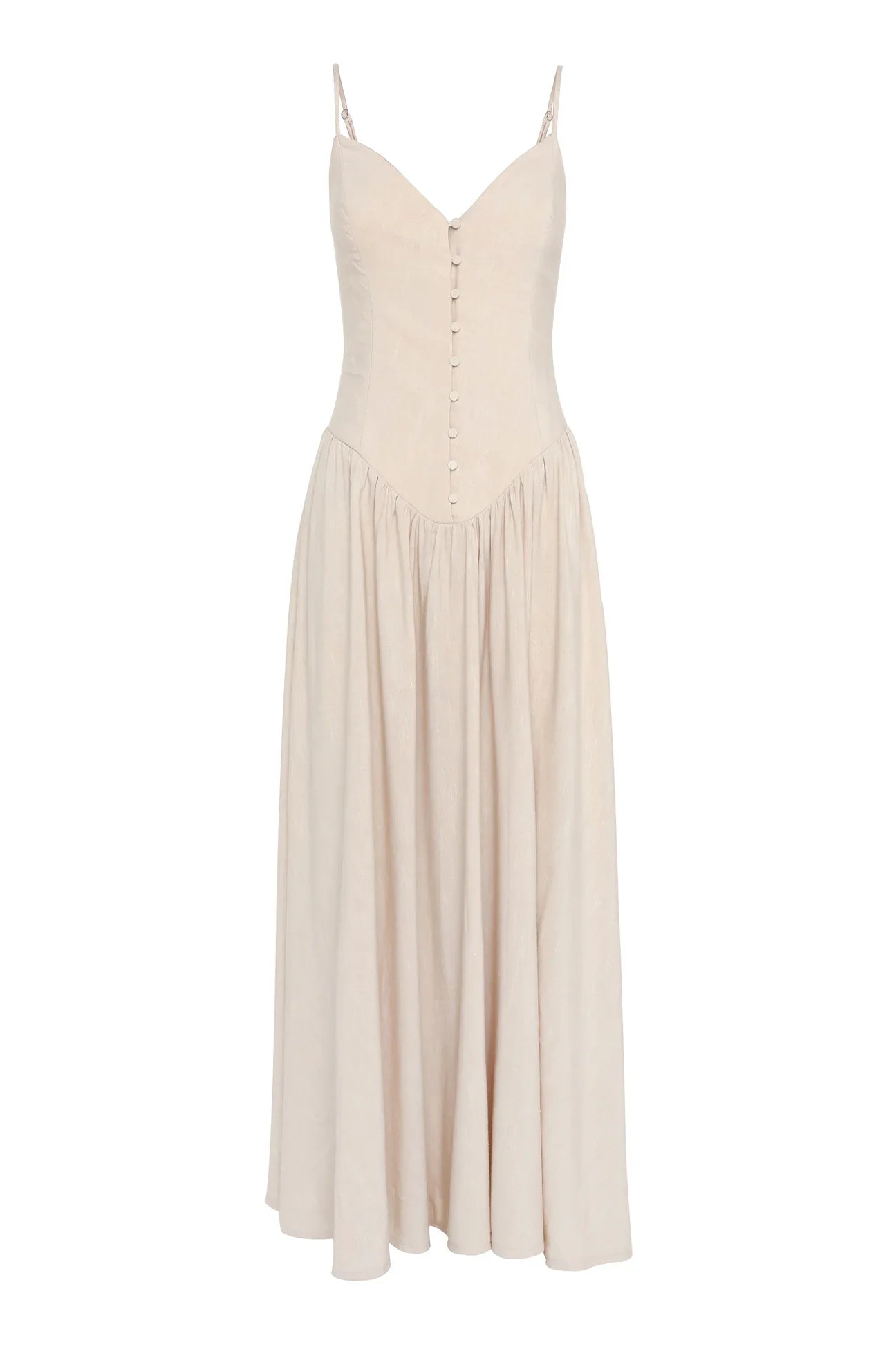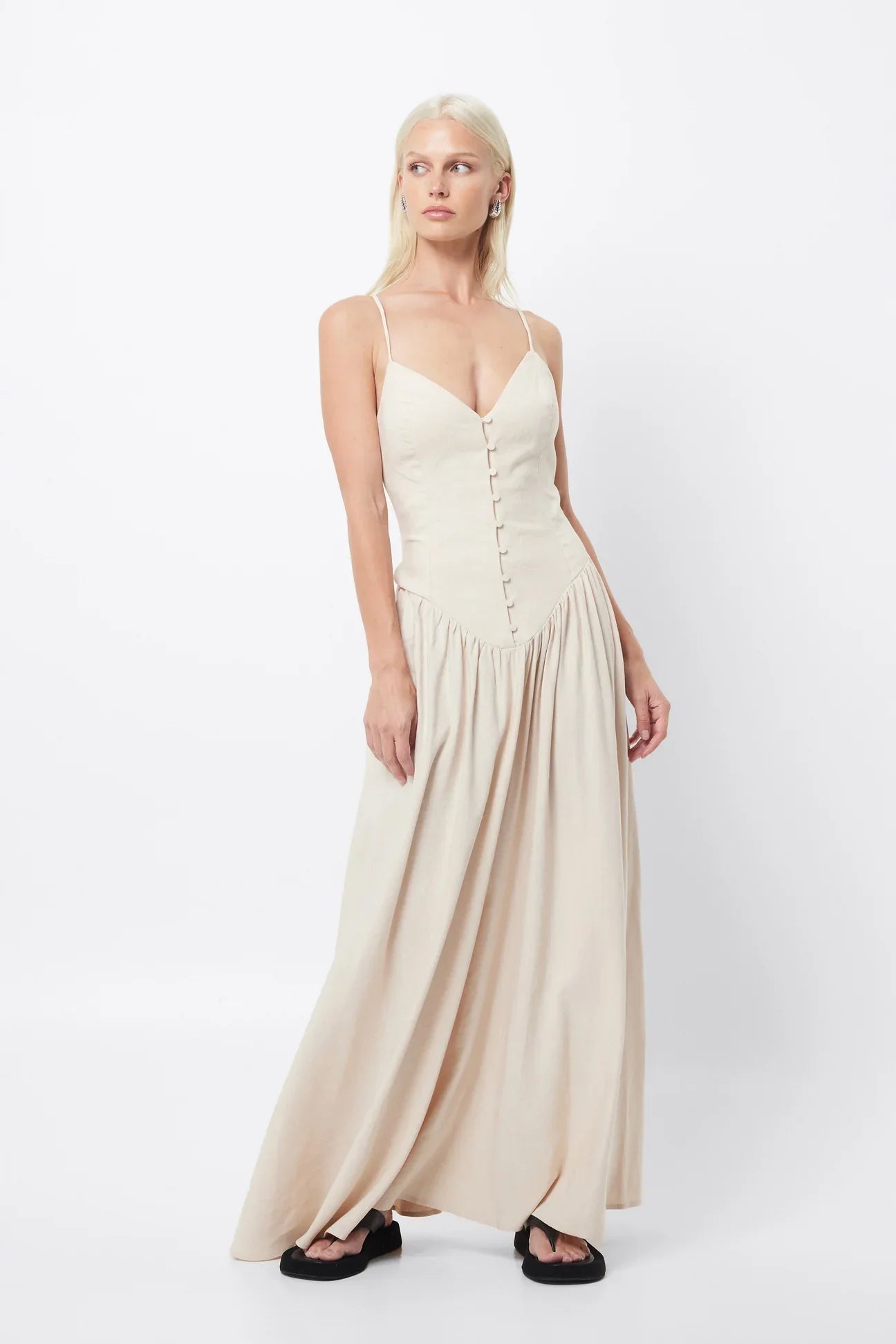 The Common Ground Maxi Dress in Natural is made from a soft, breathable linen blend fabric. It features a V-neckline, adjustable straps, and a button-down bodice. The A-line silhouette flatters all body types for a timeless, versatile look. It's the perfect casual dress for beach days and city weekends, ideal for warm days and nights.