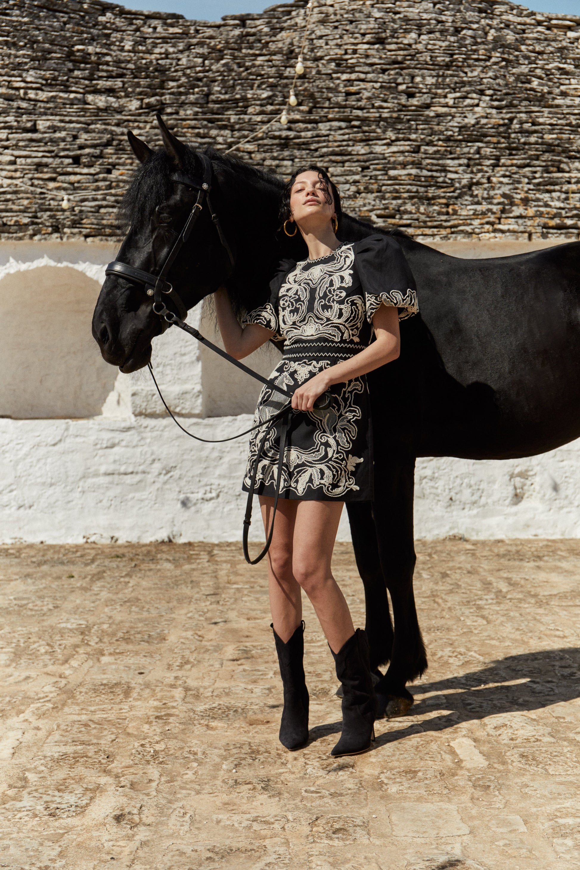 TheAzera Puff Sleeve Mini dress in black is a stunning piece with the elegant cream embroidery. Made with high-quality cotton, it offers both style and comfort. The puff sleeves add a touch of sophistication, making it a versatile and eye-catching addition to your wardrobe.