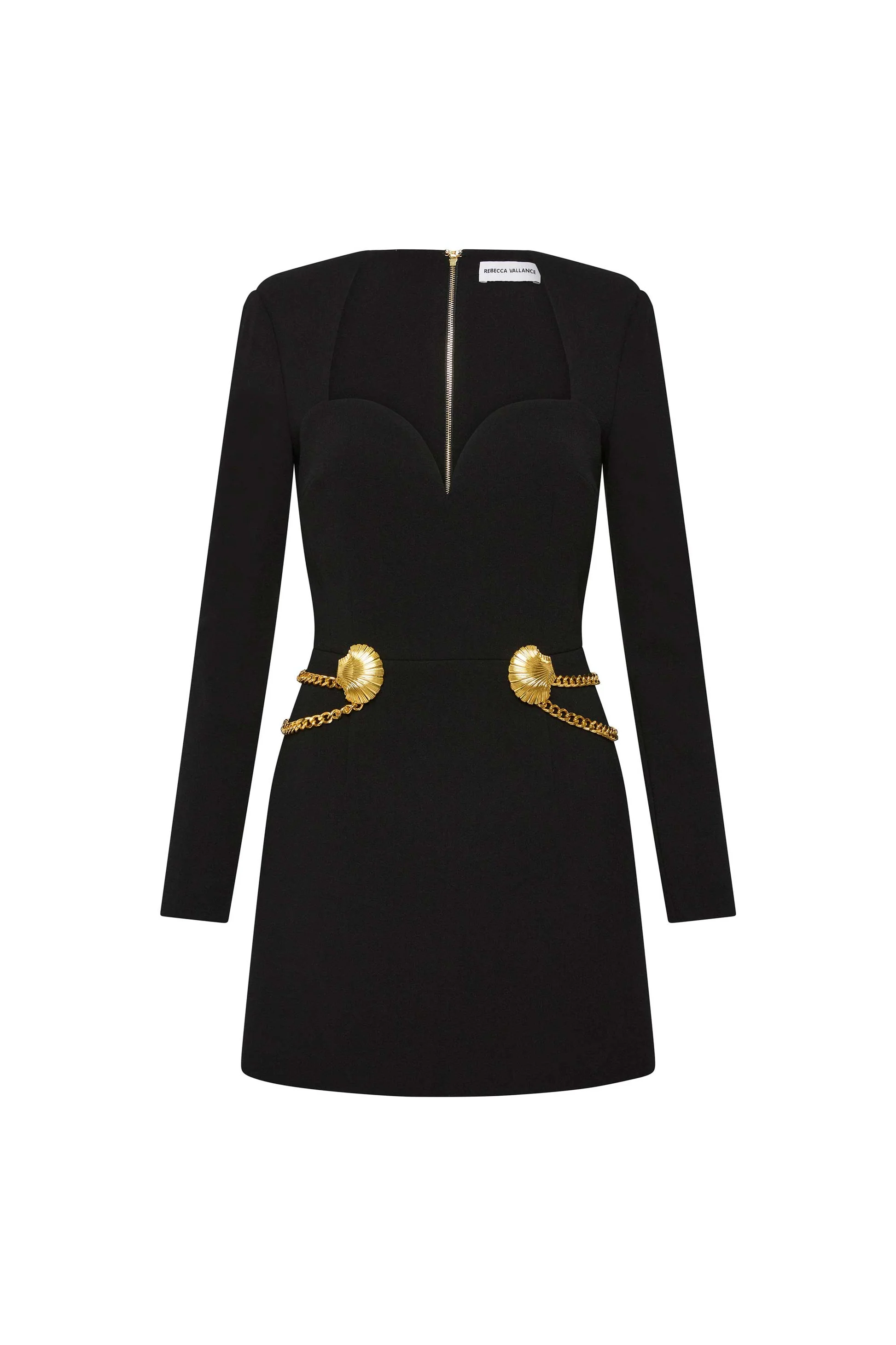 The Chelsea Long Sleeve Mini Dress is a dazzling dress, adorned with gold shell chain detailing around the fitted bodice. The long sleeves with padded shoulder and a cinched waist create a flattering silhouette, while the A-Line skirt enhances its sophisticated shape. A zip fastening at the back ensures a secure fit, and the dress is lined for comfort.