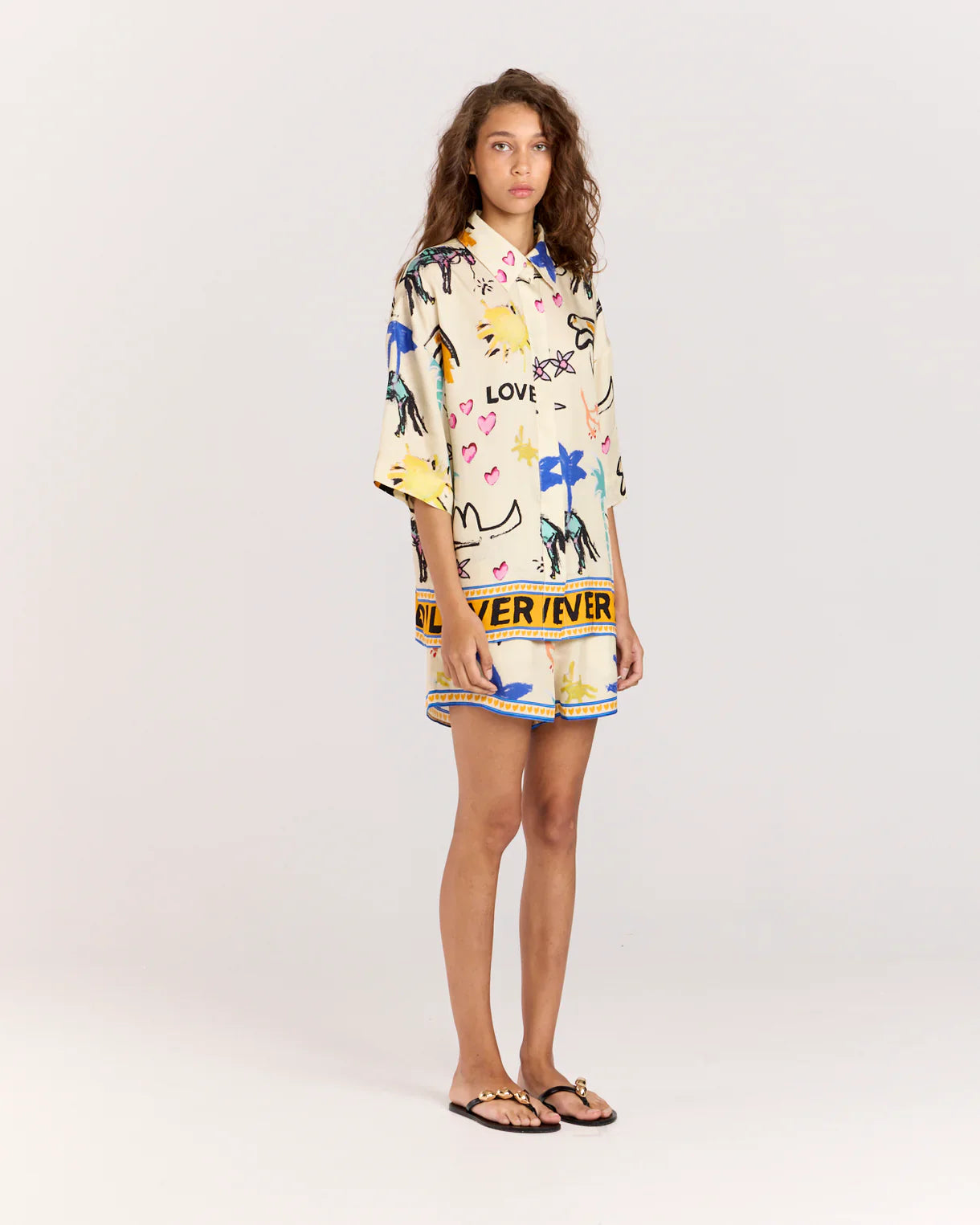 The Lover Shirt in the Lover Print by artist Jake Pedro is crafted from a matte twill blend of viscose and recycled rayon it drapes beautifully on the body. Featuring an oversized silhouette with relaxed shoulders and a concealed placket with a matte finish.