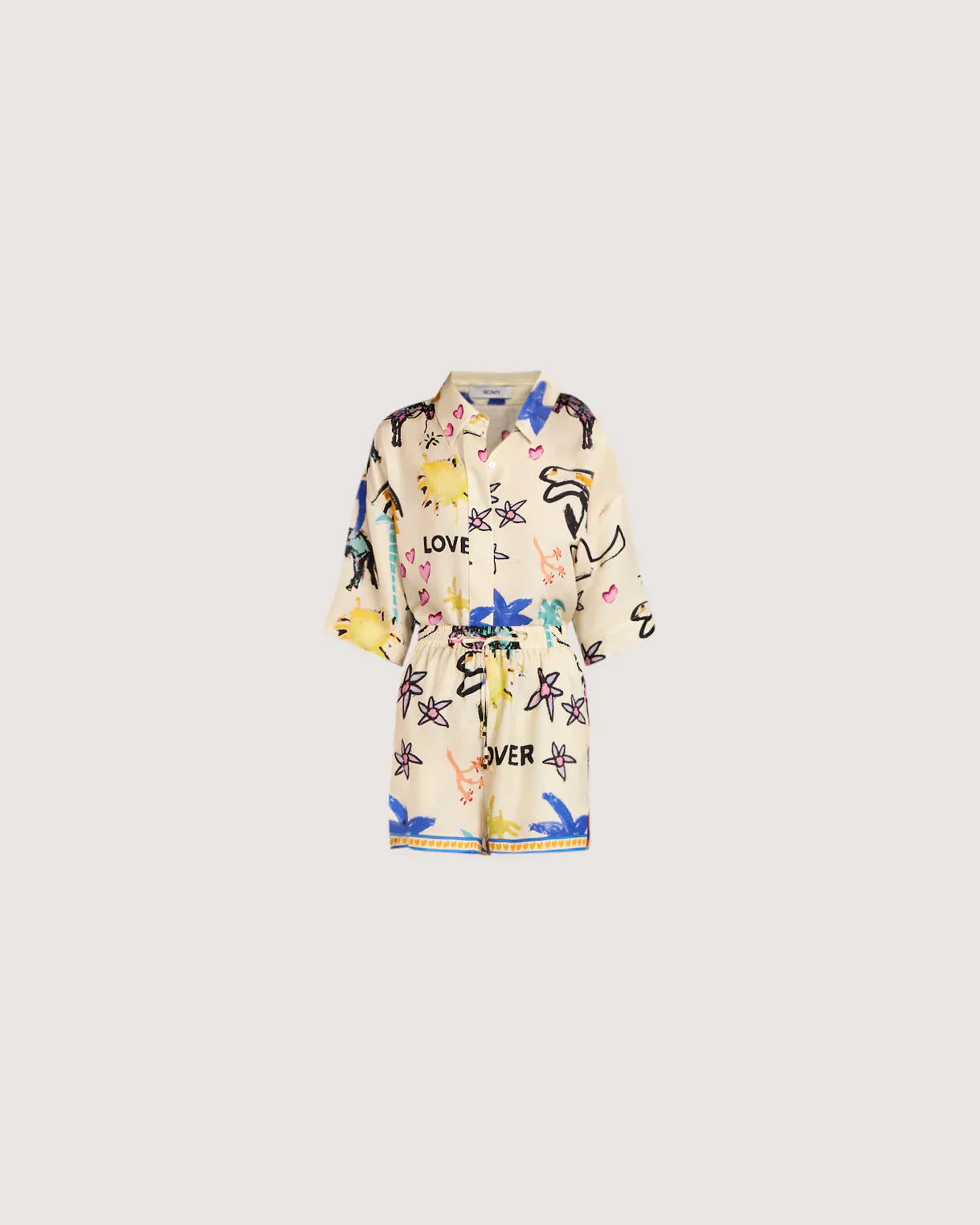 The Lover Shorts, crafted from a luxurious twill viscose rayon, offer a relaxed yet flattering fit. Featuring an elastic-waist, side pockets and waist tie with gold bead detail. Featuring artwork in collaboration with Jake Pedro, these shorts are perfect paired with the matching shirt.